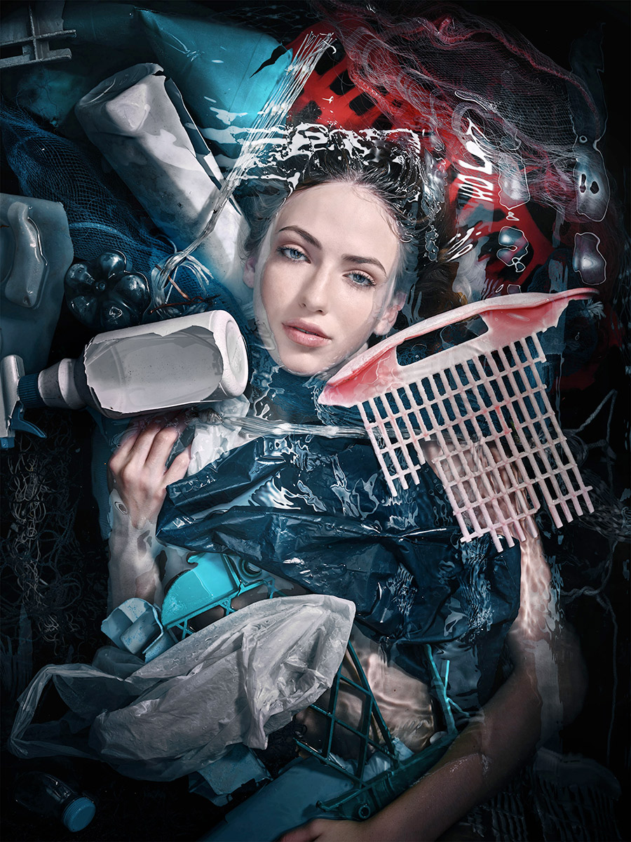 Franke played with the juxtaposition of humanity and technology in nature in “The Sinking World.” In “Plastic Ocean,” he puts beautiful models in water amid garbage—in this case, loads of plastic he and his team collected along an Italian shoreline.