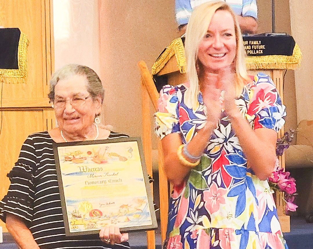 Monroe County Commissioner Holly Raschein recently presented Miriam “Mickey” Frankel — who just turned 100 — with an Honorary Conch certificate during a ceremony at the Keys Jewish Community Center Congregation Ohr HaYam (Light of the Sea) (KJCC). Frankel is a distinguished porcelain, watercolor and pastel artist who is still active in the Art Guild of the Purple Isles as well as the KJCC. The certificates are given by Monroe County to those who have made major contributions to the community, but were not born in the Keys. SUSAN GORDON/Contributed