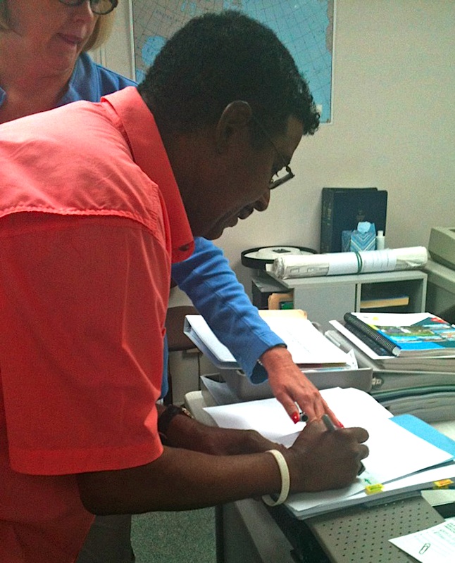 In the attached photo: It’s official! Acting as Vice Mayor, Key West City Commissioner Clayton Lopez (with the help of City Clerk Cheri Smith) signed the ordinance that repealed the city’s blue law. Residents and visitors no longer need to wait until noon on Sunday to purchase liquid libation. Photo by Angela Budde