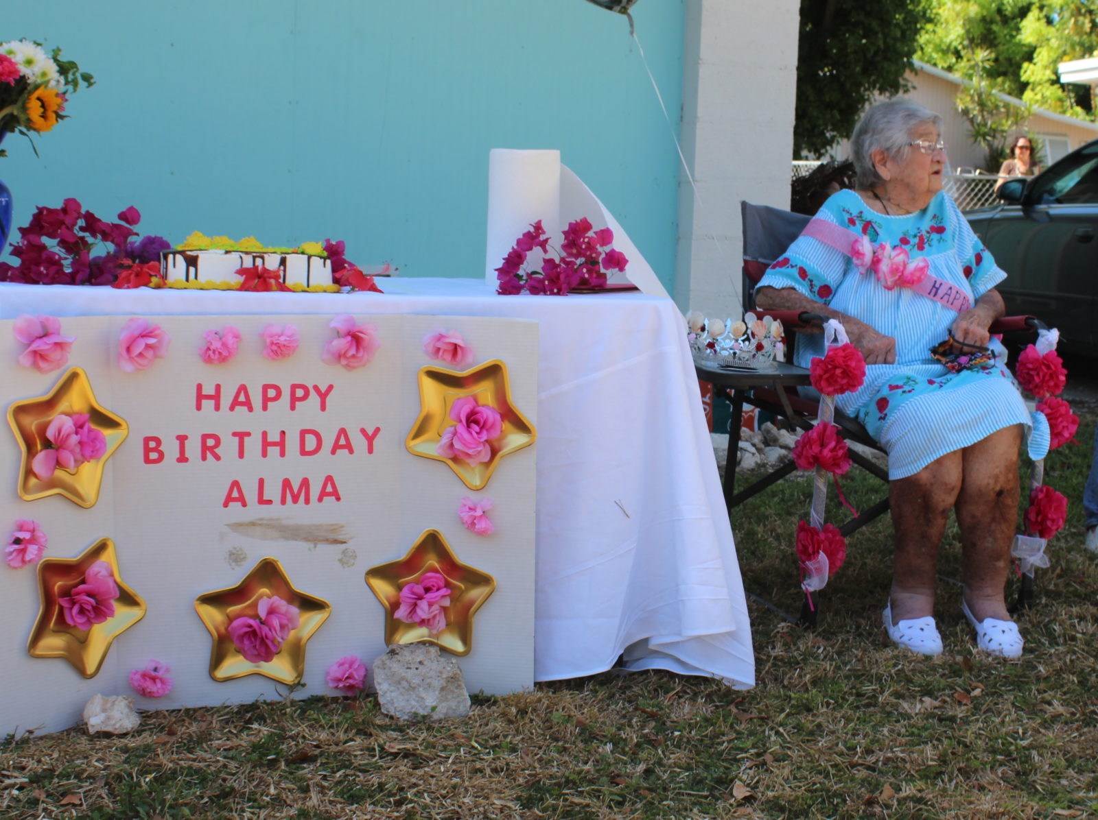 “This is one of the best birthdays ever,” Dalton remarked as she sat in the shade with a few family and friends surrounding her, while maintaining their social distance. As cars drove by, they presented cards for Alma’s family to grab and bring to her.