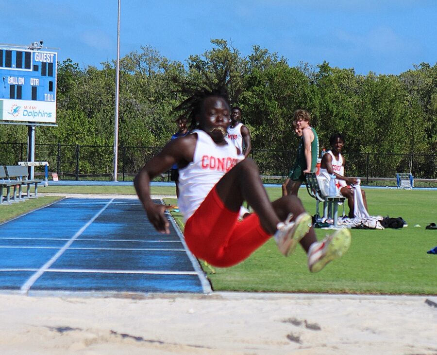 Jeff Dejean also had a trio of wins, taking first place in the 100-meter dash in 11.25 seconds and the long jump with a 21’8” leap. Dejean’s third win was in the Conchs’ 4×100 relay, where he teamed up with Cavane Herron, Roman Van Loon and Walson Morin, finishing in a blazing 43.83 seconds. Morin and Herron were first and second in the 200, crossing in 22.97s and 23.45s, respectively. Van Loon was second in the 100 behind Dejean.