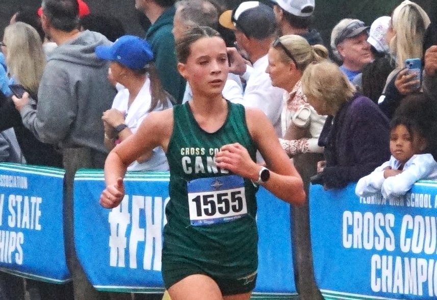 Wheatley’s time, 20:27, was good for 61st place, and while a bit shy of her personal best, was excellent given the challenging course. Apalachee follows a hilly, two-loop tree-lined course with twists and turns throughout. In addition to the hills, something very difficult to train for in the Keys, Wheatley raced through the early-morning fog in her first appearance at states after narrowly missing a spot last season.