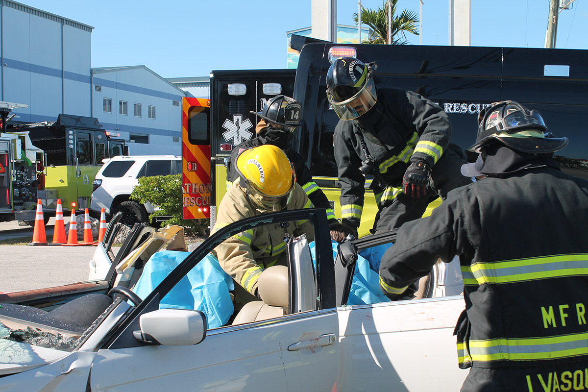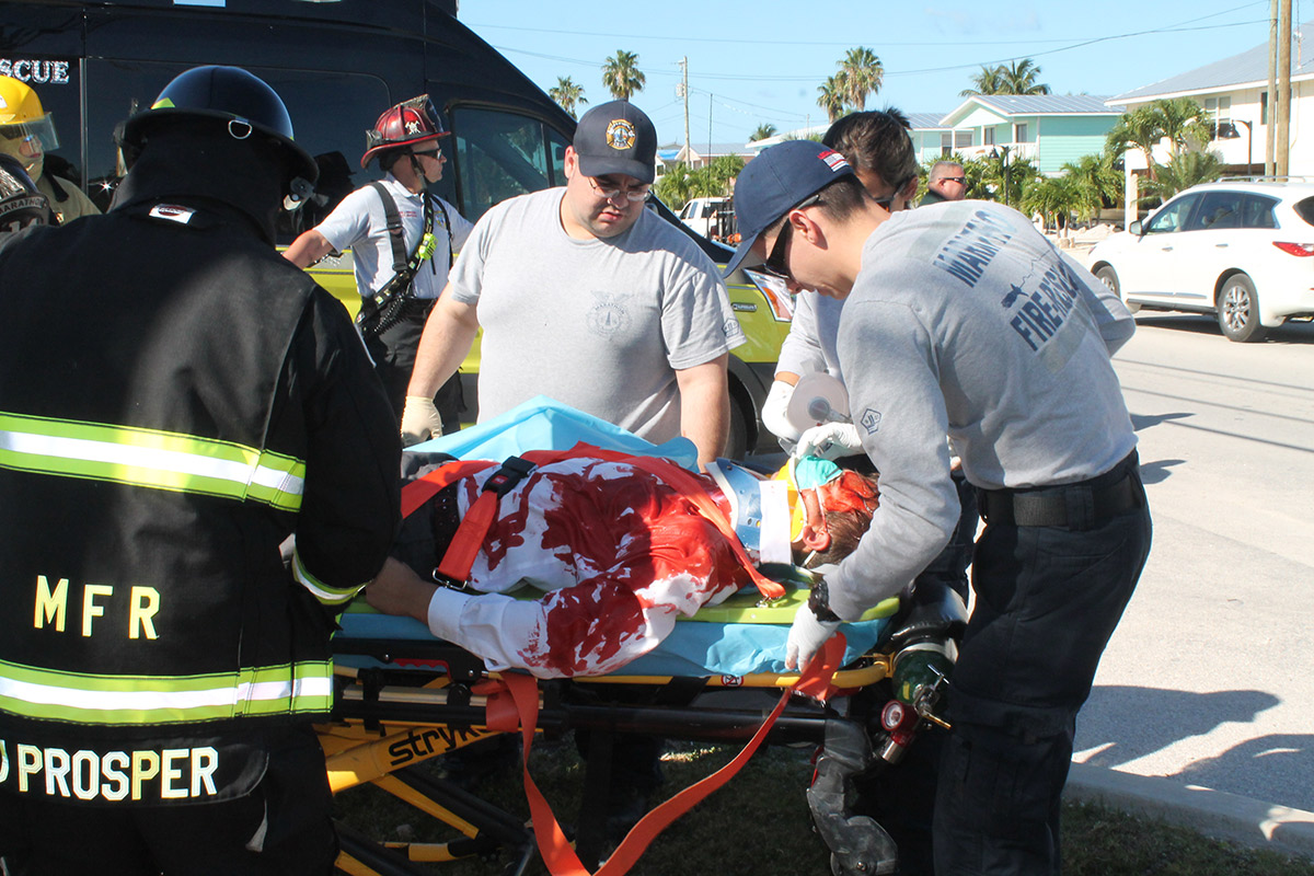 One arrested, one injured, one dead. That was the tally for the demonstration on April 22 held at Marathon High School five days before prom, considered by man to be the most dangerous weekend for high school students. Marathon fire rescue and members of the Monroe County Sheriff’s Office put on a sobering show for a crowd of students, starring Sophomore Matthew Kratzert and senior Nicole Joniaux who played the “victims” in the demonstration and even dressed the part in prom attire. They’re were attended to by Lizdania Santana, who graduated MHS in 2018, and Christopher Sanchez. SARA MATTHIS/Keys Weekly