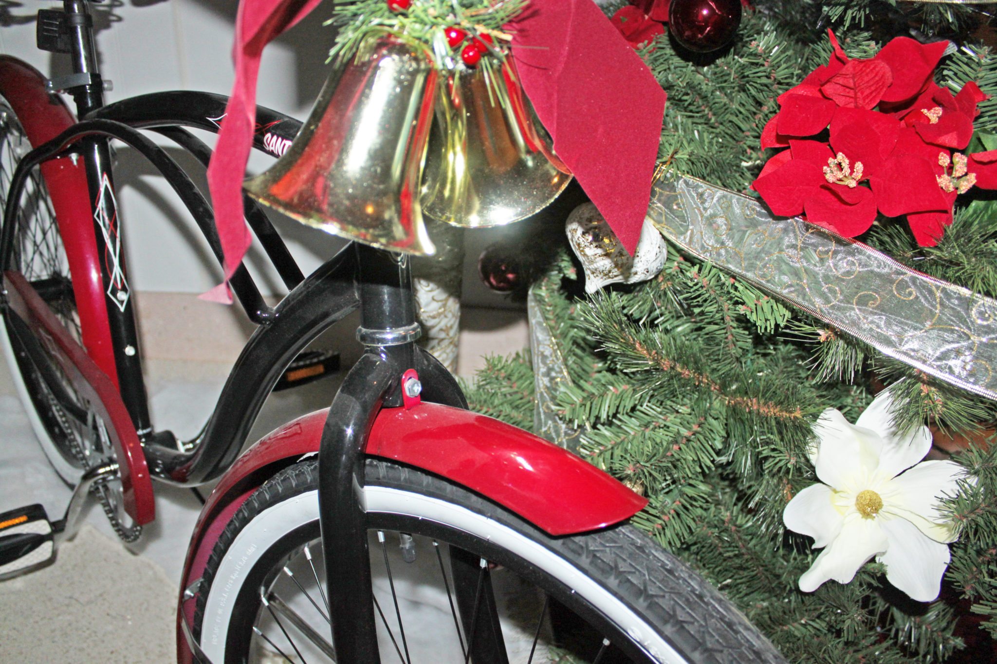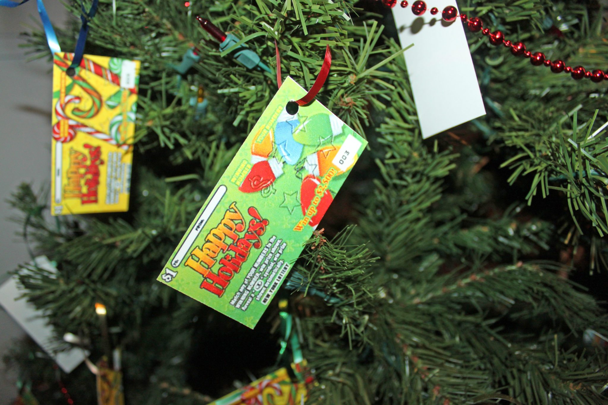 There’s a lot of creativity in those trees and, at the risk of sounding crass … good stuff! A bicycle, toys, lottery scratch-off-tickets, even …. booze. Yes, the Moms of Marathon’s tree is themed “It’s 5 o’clock somewhere.” It’s hung with tiny bottles of liquor, plus it has 11 baskets of cheer underneath. Yes, we’re in it to win it. (Literally. We think it would make a marvelous New Year’s Eve starter kit.)