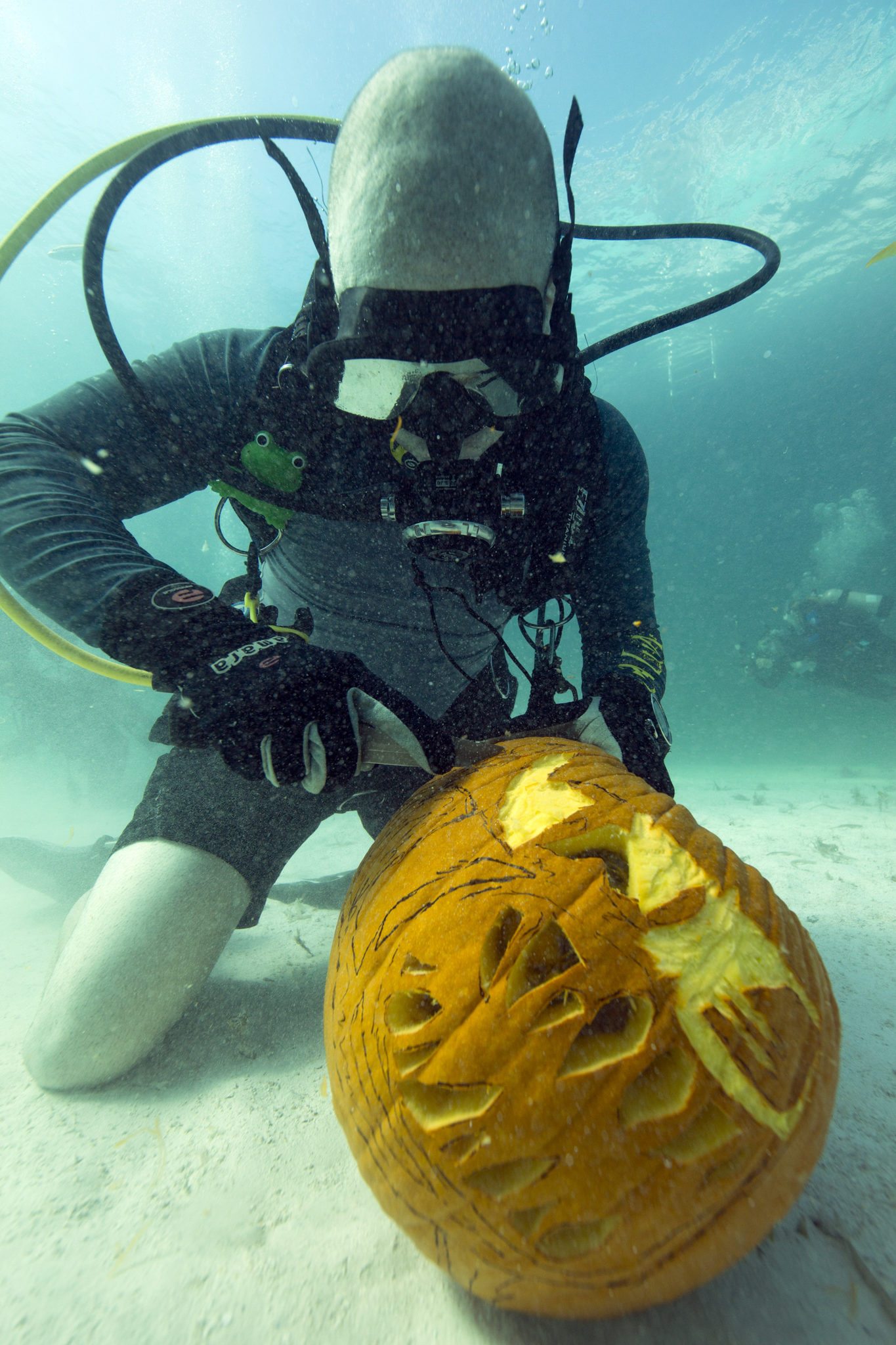 KEY LARGO, Florida Keys – A crafty group of divers submerged 30 feet beneath the surface in the Florida Keys National Marine Sanctuary to carve jolly jack-o-lanterns during the annual Underwater Pumpkin Carving contest Sunday about six miles off Key Largo.