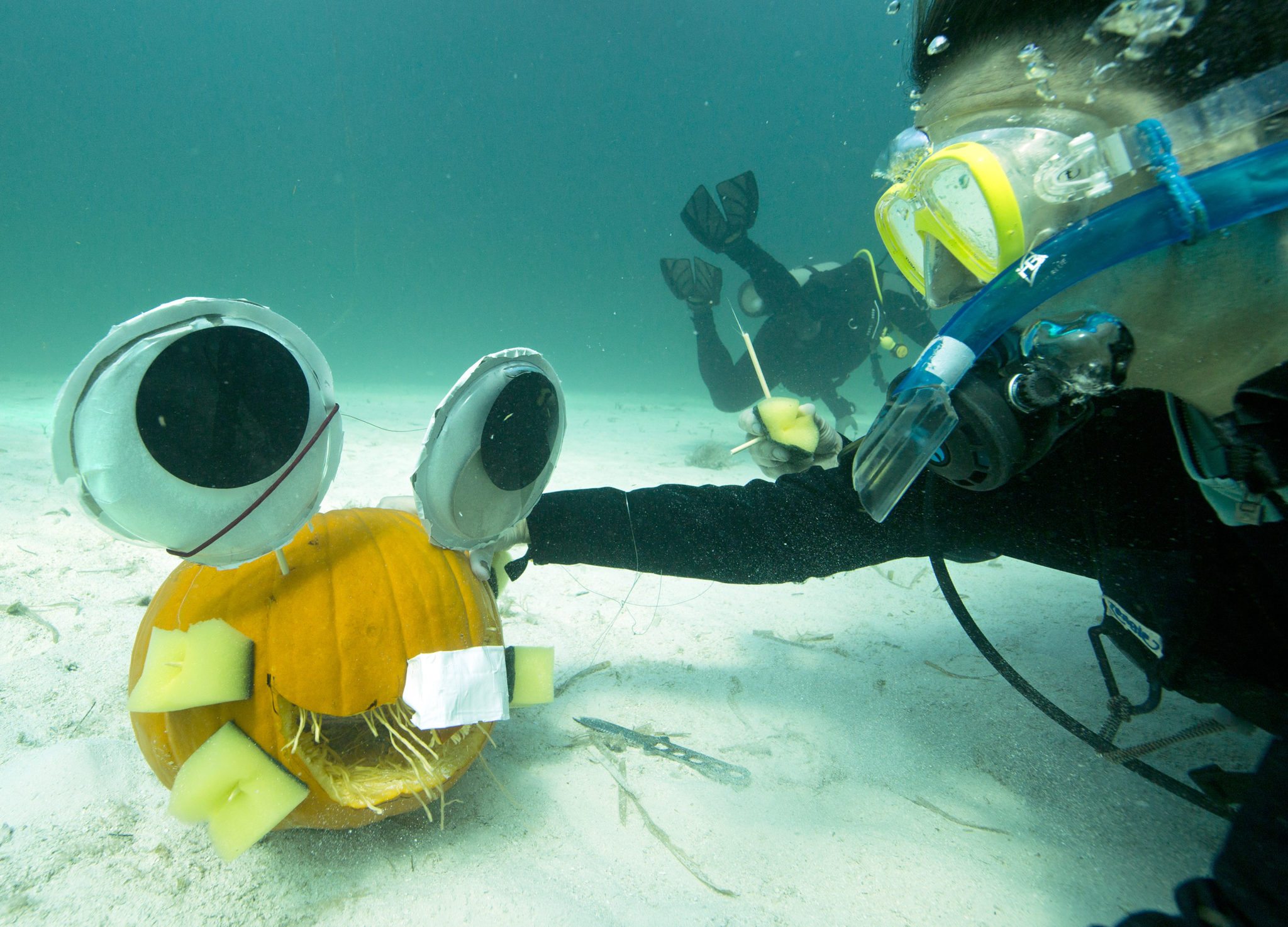 Underwater artists of all ages submerged with knives to pare fun-loving facial features, sea creatures and accessorize their orange gourds. Divers also were challenged to keep the hollowed out pumpkins from floating off while they carved their works of art.