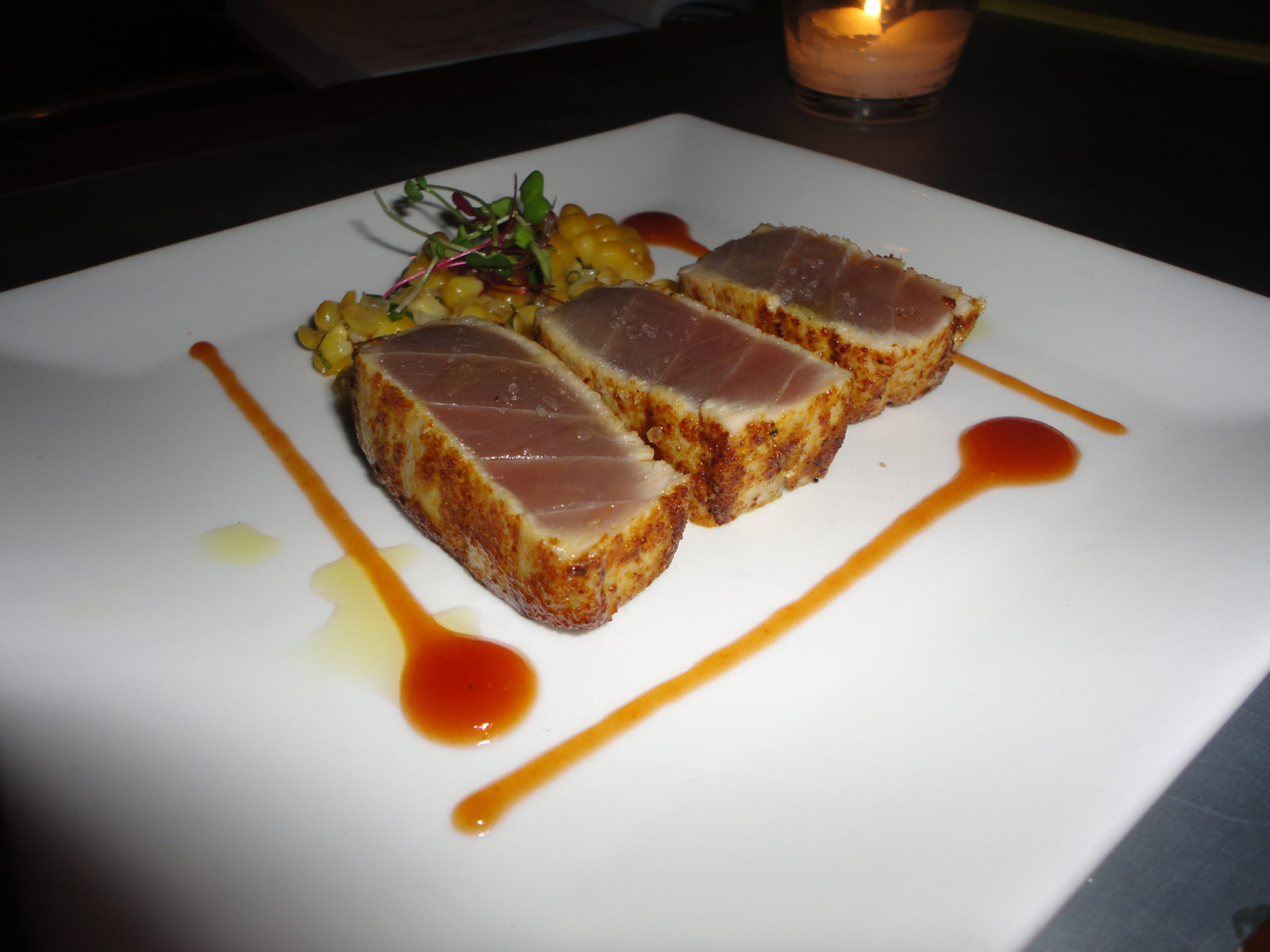 The breeze is wafting through a hidden garden, and some business associates announce they’re meeting us. Our mouths are watering over the Costa Rican Peach Palm paired with sweet potato salad and a cilantro almond pesto before we sink our forks into Seared Diver Scallops with foie gras flan, honeydew melon and a sauternes sauce.