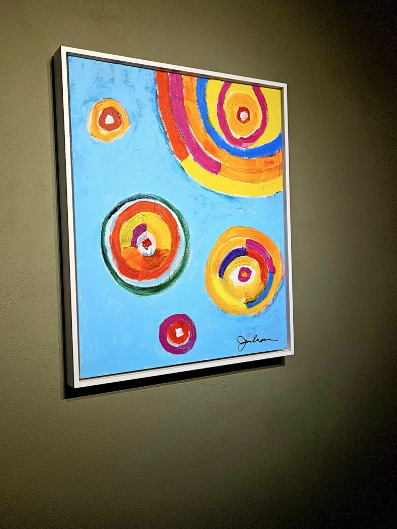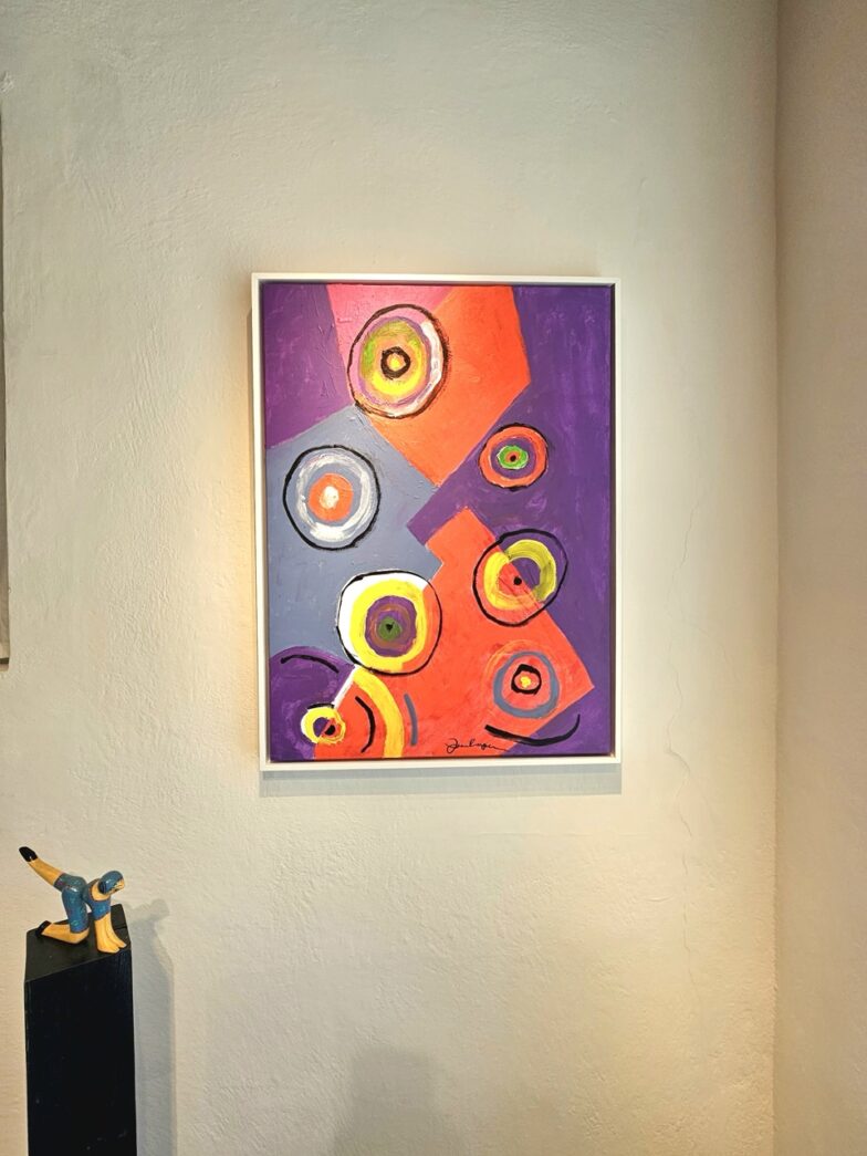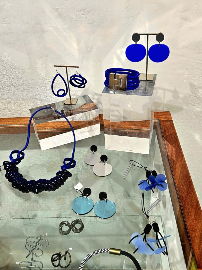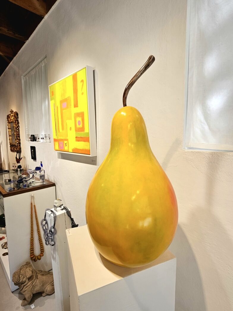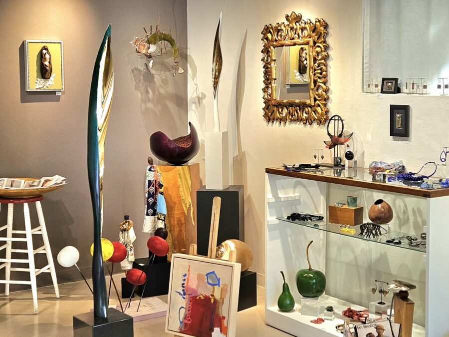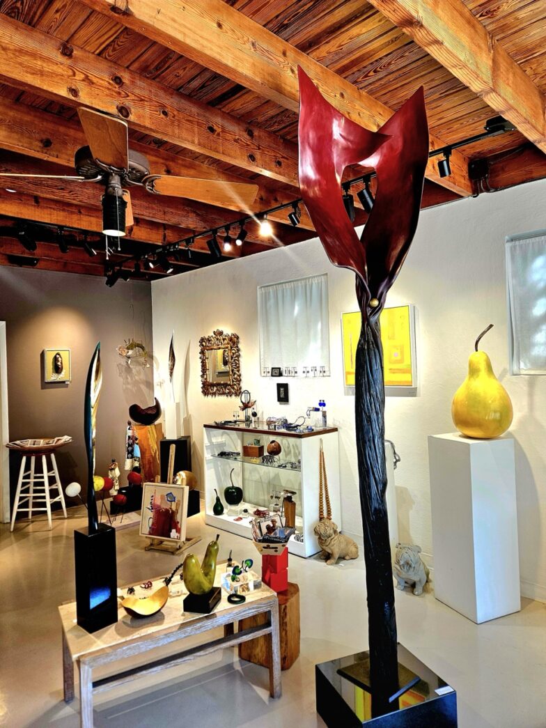 The gallery currently features vibrant paintings by Jean Carper alongside Helen’s intriguing wooden sculptures, handmade jewelry and more.