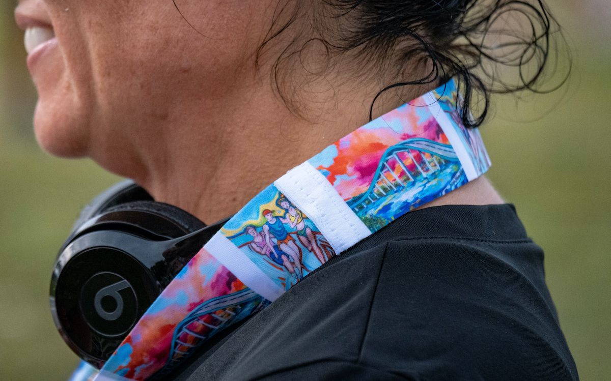 The medal ribbon for the First State Bank Key Largo Bridge Run Half Marathon & 4 Mile Run/Walk was created by local artist Carmen Sotolongo Kelley and is pictured here on runner Claudia Stober.