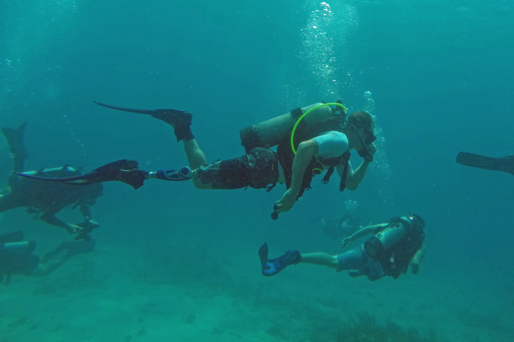 The soldiers not only helped plant the corals, with the help of the students, but overcame many obstacles most divers don’t have to think about — like pumping all the air bubbles out of special underwater prosthetics in order to maintain the proper suction. One diver tangled with his prosthesis 30 feet underwater. He swam to the sandy area and laid face down while his dive buddy checked out the issue. A minute later, they each gave the OK sign and continued on their coral planting mission.