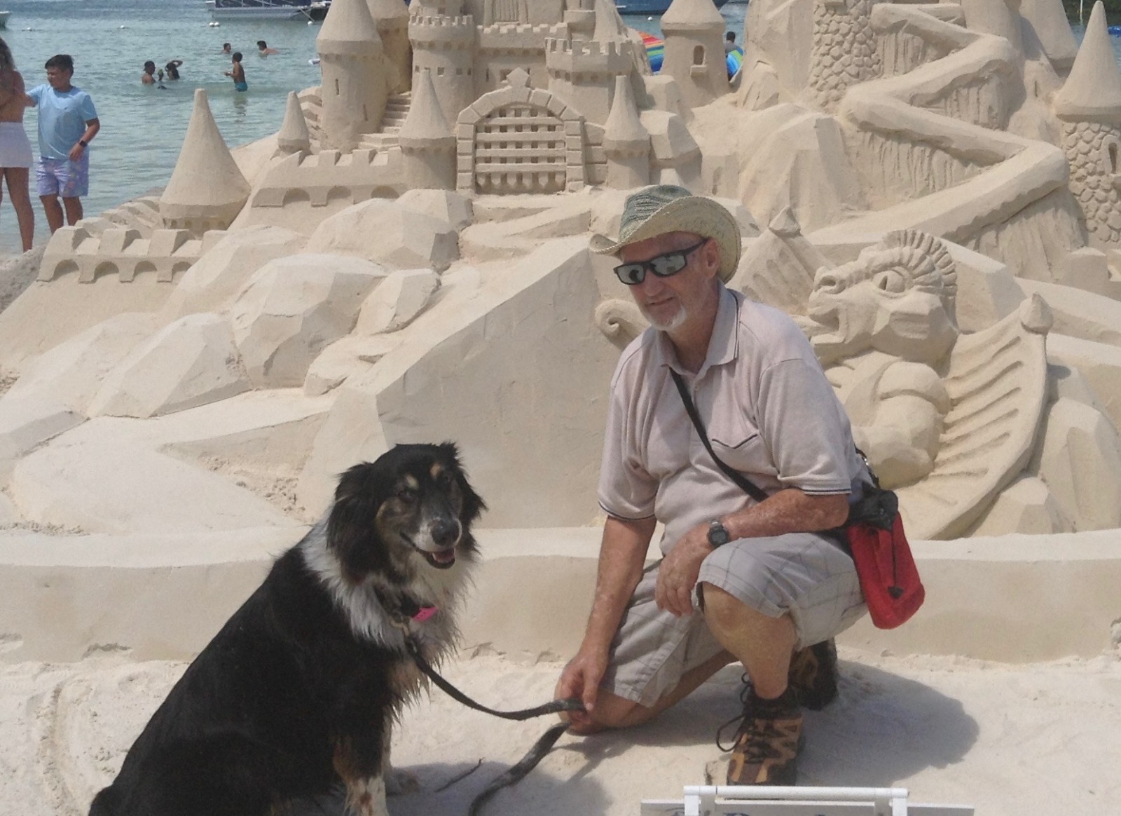 a man kneeling down next to a dog on a beach