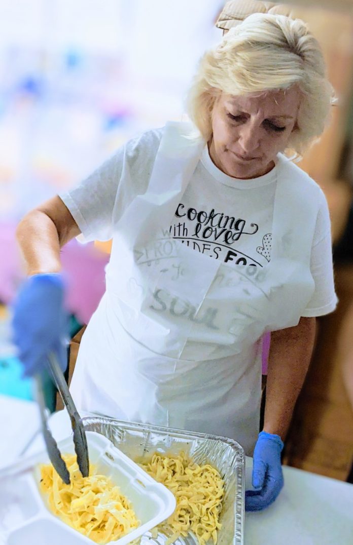 “A lot of our senior citizens can no longer drive to the grocery store, and if they live alone, they don’t feel like cooking for just one person, so Cooking with Love ensures they receive a hot, healthy meal once a week,” Higgs said on a recent Saturday morning while dishing out 200 helpings of pasta, stuffed chicken breasts, mixed vegetables and fresh pineapple.