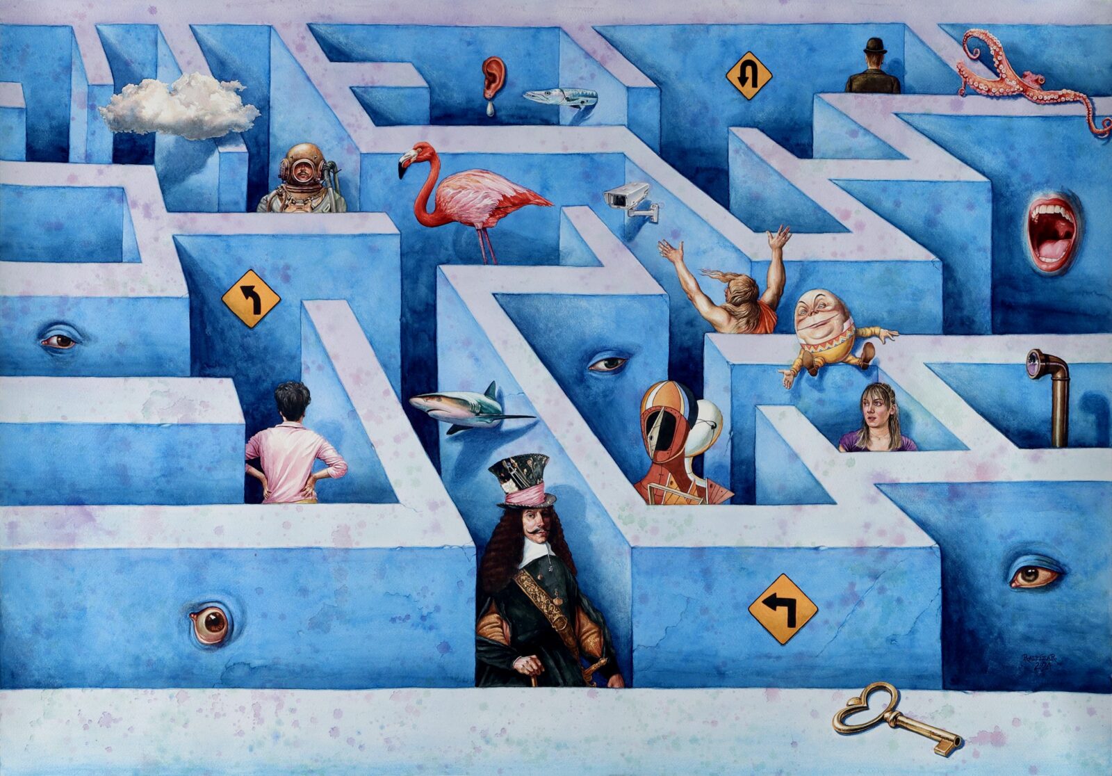The show opens with an Alice situated within a blue labyrinth, a space where the absurd and modernity converge. From there, the exhibit expands to include works from Alpizar’s Small Bonds series, in which he pays homage to influential figures from the cultural life of Key West, past and present.