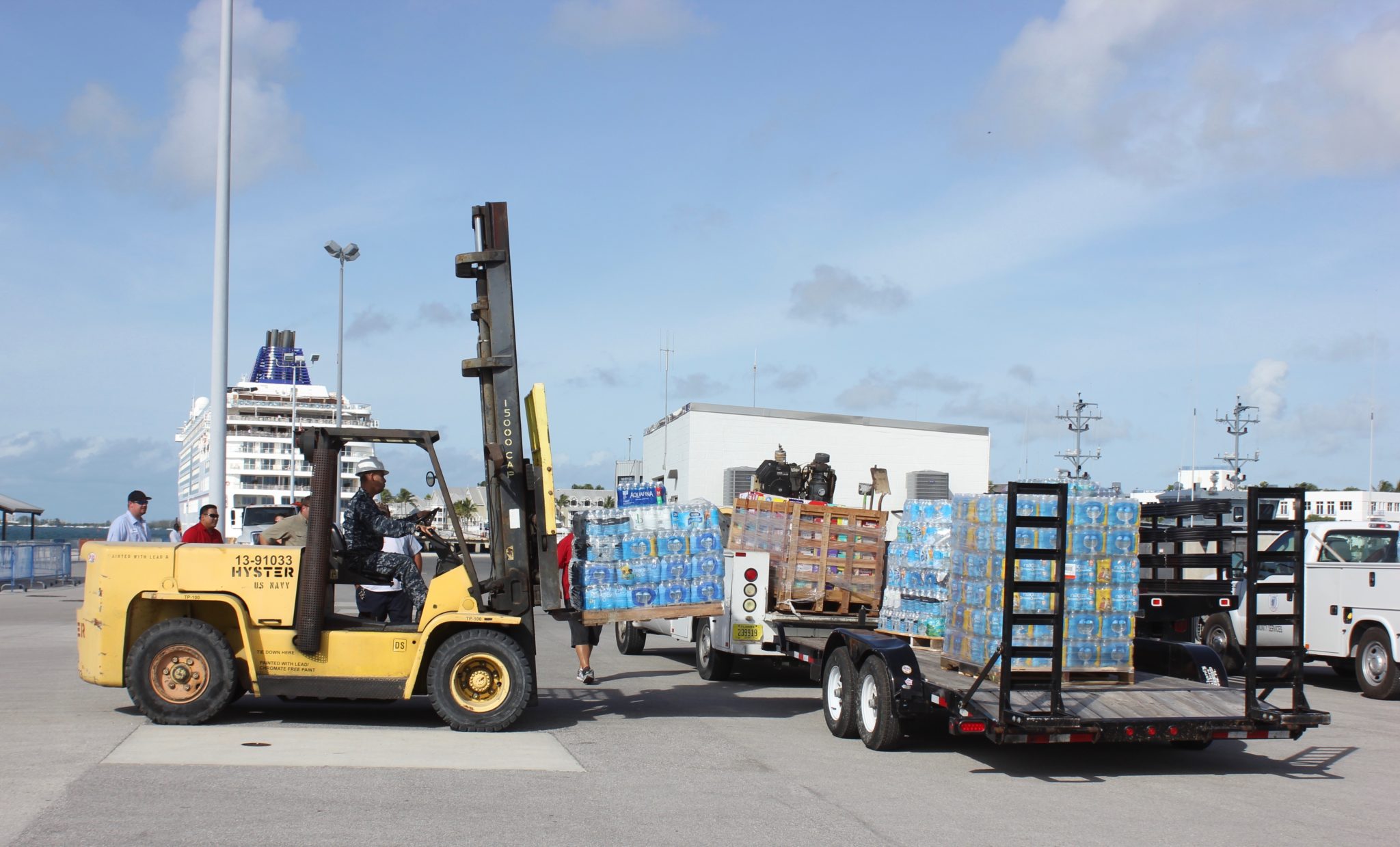 An idea hatched at a simple happy hour in Marathon, since 9 ships of the Bahamian Defense Force were riding out Hurricane Matthew in Key West, why not send them home with some supplies? In just a matter of days, City managers Charles Lindsey from Marathon and Jim Scholl from Key West were able to organize donations of more than 25,000 bottles water and 1000 diapers up and down the Keys. Strunk Ace Hardware helped provide palettes and plastic wrap for donations. Then Friday night, Bahamian Commander Carlon Bethel set sail with two dozen palettes headed to the most ravaged part of our sister islands, New Providence home of the capital Nassau.