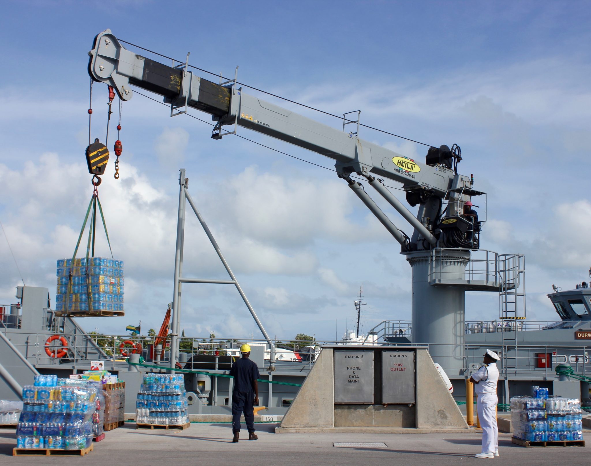 Bahamian Defense Ships take water and diapers home