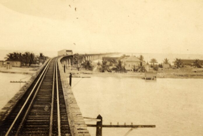 Railroad piers supporting the Key West Extension of Henry Flagler’s Florida East Coast Railway were erected on Pigeon Key, allowing the train to roar 22 feet above it. The Jan. 21, 1912, edition of the Indianapolis Sunday Star printed a story mentioning Pigeon Key: “The camps are in charge of a resident or division engineer with the one at Pigeon Key presently the most active. At high tide, Pigeon Key is about two acres in extent and perhaps three acres at low tide. There are four bunkhouses, each designed to hold 64 men; one of them for the foremen, who are housed apart from the laborers. Each has a reading room with good lights. Good mattresses are provided on standard double-decked bunks, with plenty of clean bedclothes; all laundry work being done by the company. Once a week all beds are washed and thoroughly disinfected to keep any parasites from getting a start.”