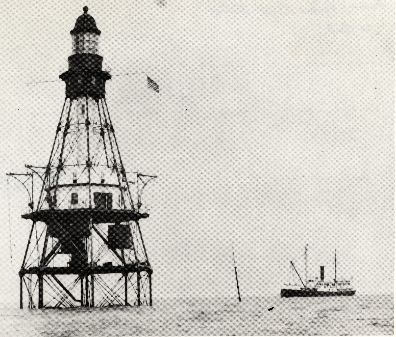 During the building of the Fowey Rocks Light, Soldier Key was used as a base of operations. Once the iron beams were driven down into the reef and the light’s skeleton was in place, the lighthouse’s platform was constructed. When the platform was finished, workers lived in a makeshift camp atop it to ensure that adverse conditions and rough water would not deter them from reaching the light during the construction period.