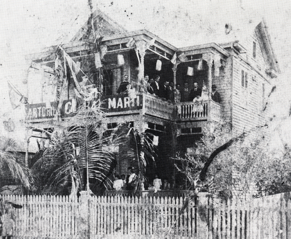 Cuban Revoluntionary, Jose Marti (second floor, second from right), gives a speech from the front porch of his Duval Street home.
