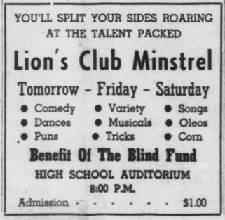 “Minstrel” originates from the Latin “ministerialis,” meaning “servant.” A May 22, 1933, article in the local daily newspaper promoted the “Merry Makers Minstrel show,” saying, “Don’t miss Bugs Warner in his Ku Klux Klan song. This is going to be a hit. Ed Gray’s portrayal of the colored person in the ‘Coontown Wedding’ is worth the price of a whole row of front seats.”