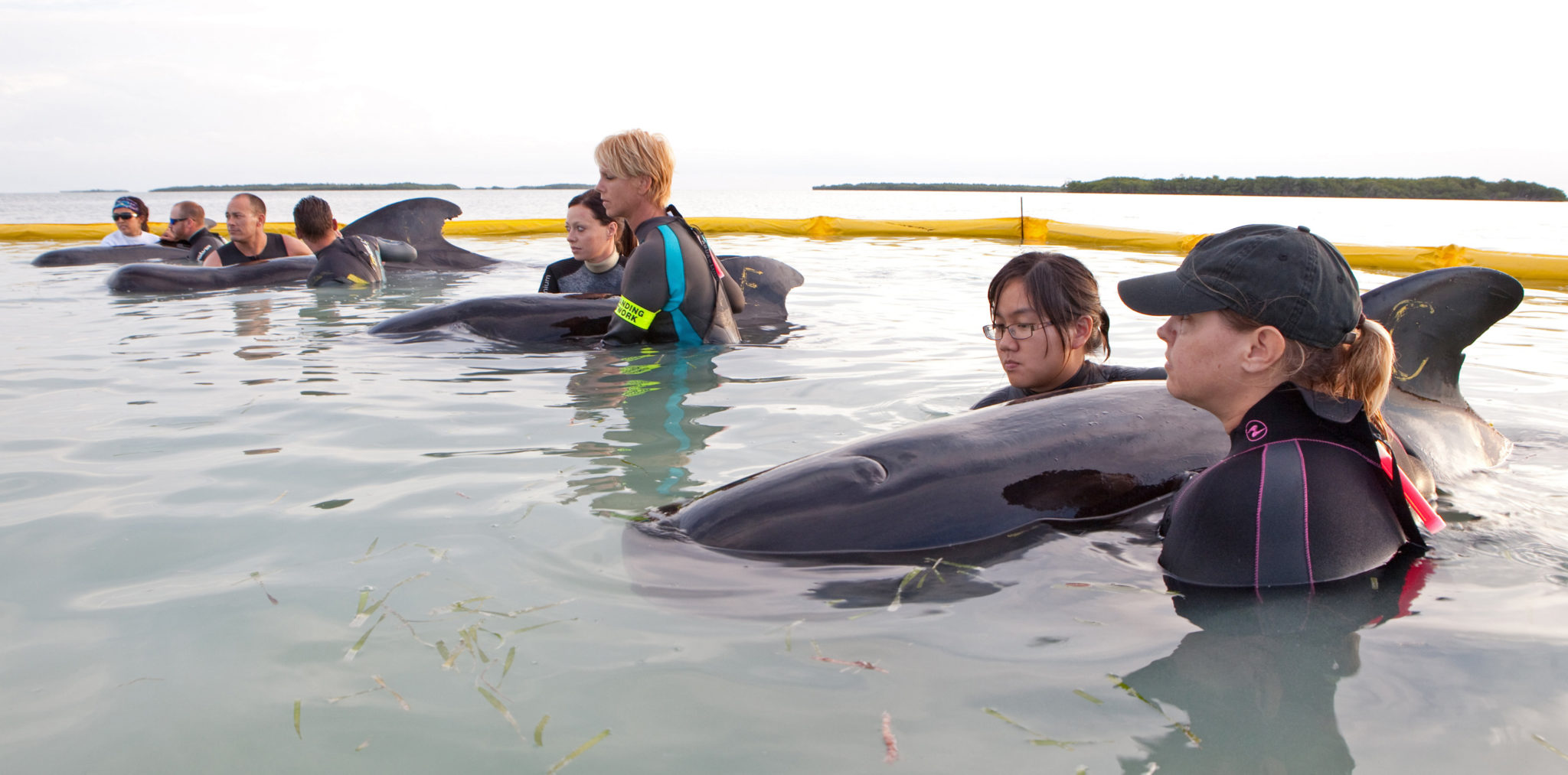Staff members and volunteers from the Marine Mammal Conservancy care for four pilot whales Friday, May 6, 2011, in a temporary sea pen at Cudjoe Key, Fla. The four whales are part of a group of about 18 that stranded Thursday, May 5, off the lower Florida Keys. Three other whales are being cared for in the pen, two died and responders are endeavoring to secure the others in the sea pen. Photo Courtesy: Bob Care/Florida Keys News Bureau/HO