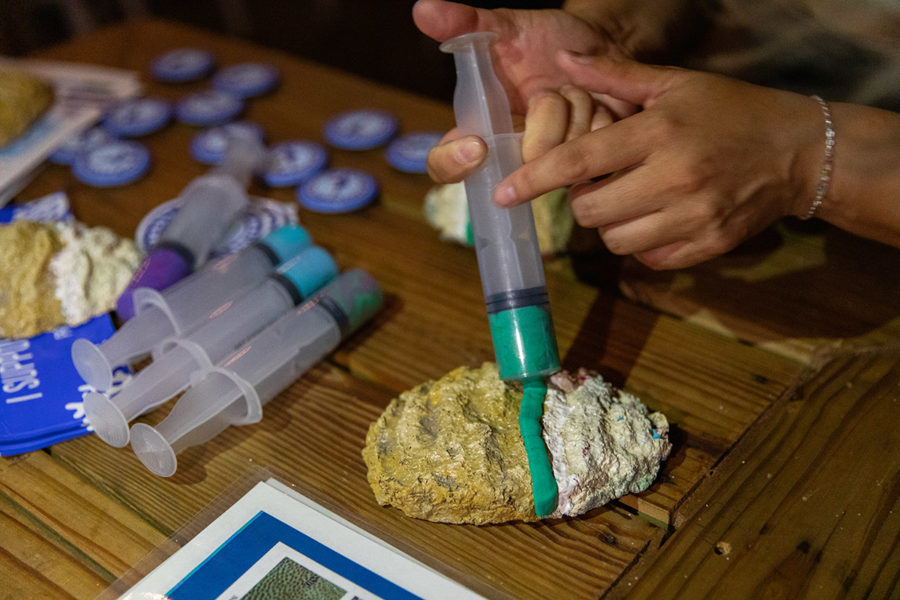 “We get to invite everyone here who’s a diver to go see the coral and teach them how to identify what’s healthy and what’s sick. So, they get to go out and see the actual impact that this really devastating disease is having on their local reef,” Williams said as she prepared a hands-on training demonstration at the restaurant. Using modified syringes filled with Play-Doh, she showed locals and visitors, old and young alike, how to properly deploy an antibiotic paste on a model disease coral.
