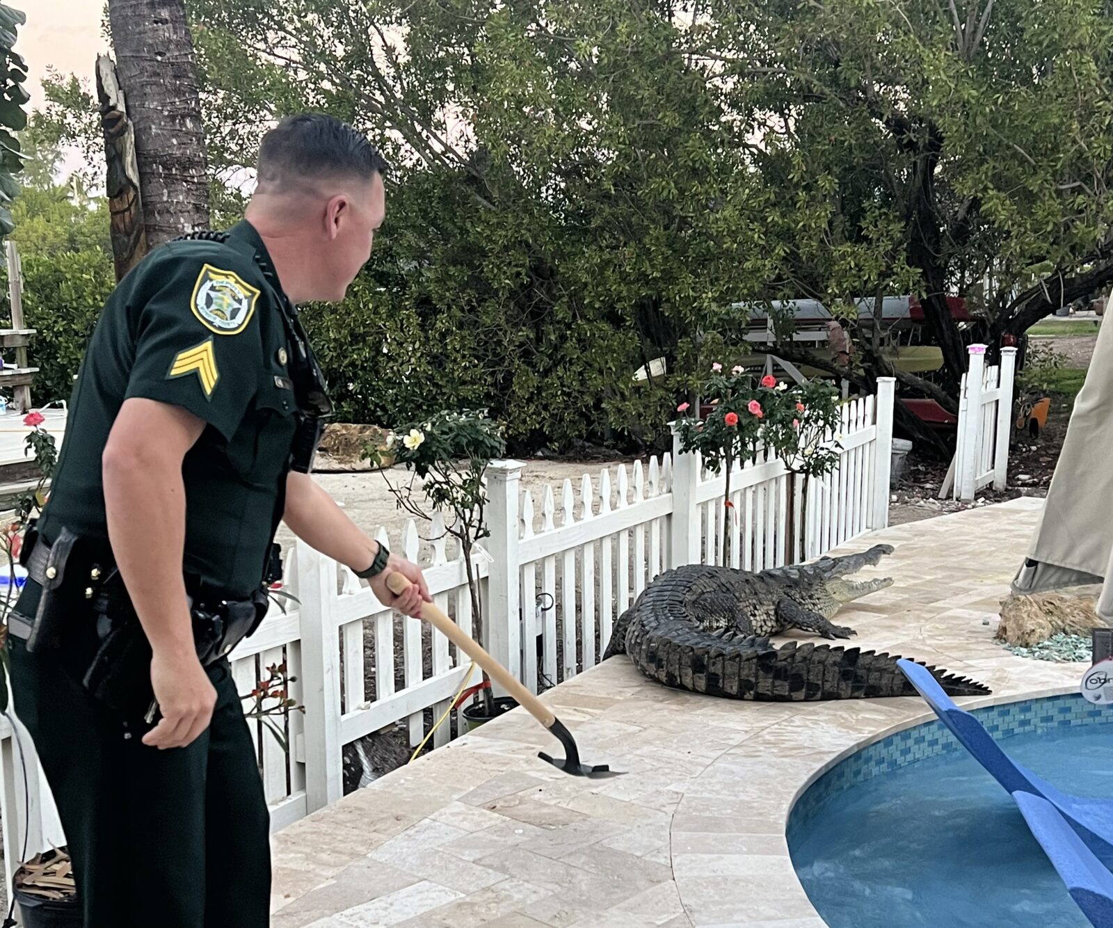 Crikey! MCSO deputies deal with more than just speeders and the occasional cocaine brick – a LOT more. Sergeant James Hager channeled his inner Steve Irwin during a call of a crocodile lounging in a pool at a Key Largo home on Jan. 31. Hager and a resident were seen on video using long-handled tools to shoo the crocodile away from the property and back toward the water.