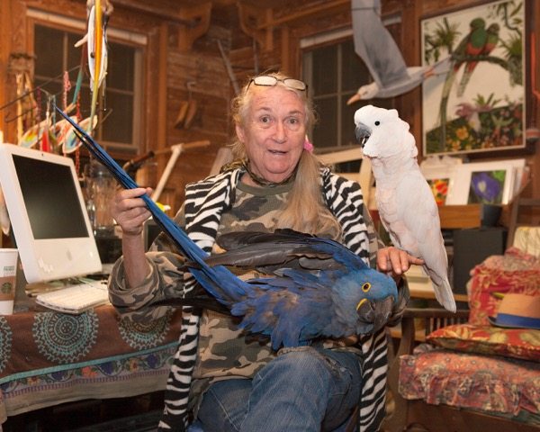 Now that the “biomass” is gone, Forrester is eager to share her story. Birds squawk and cry out from different parts of the house but she seems oblivious to them. Mr. Peaches, a friendly Muluccan Cockatoo, sits on her arm.