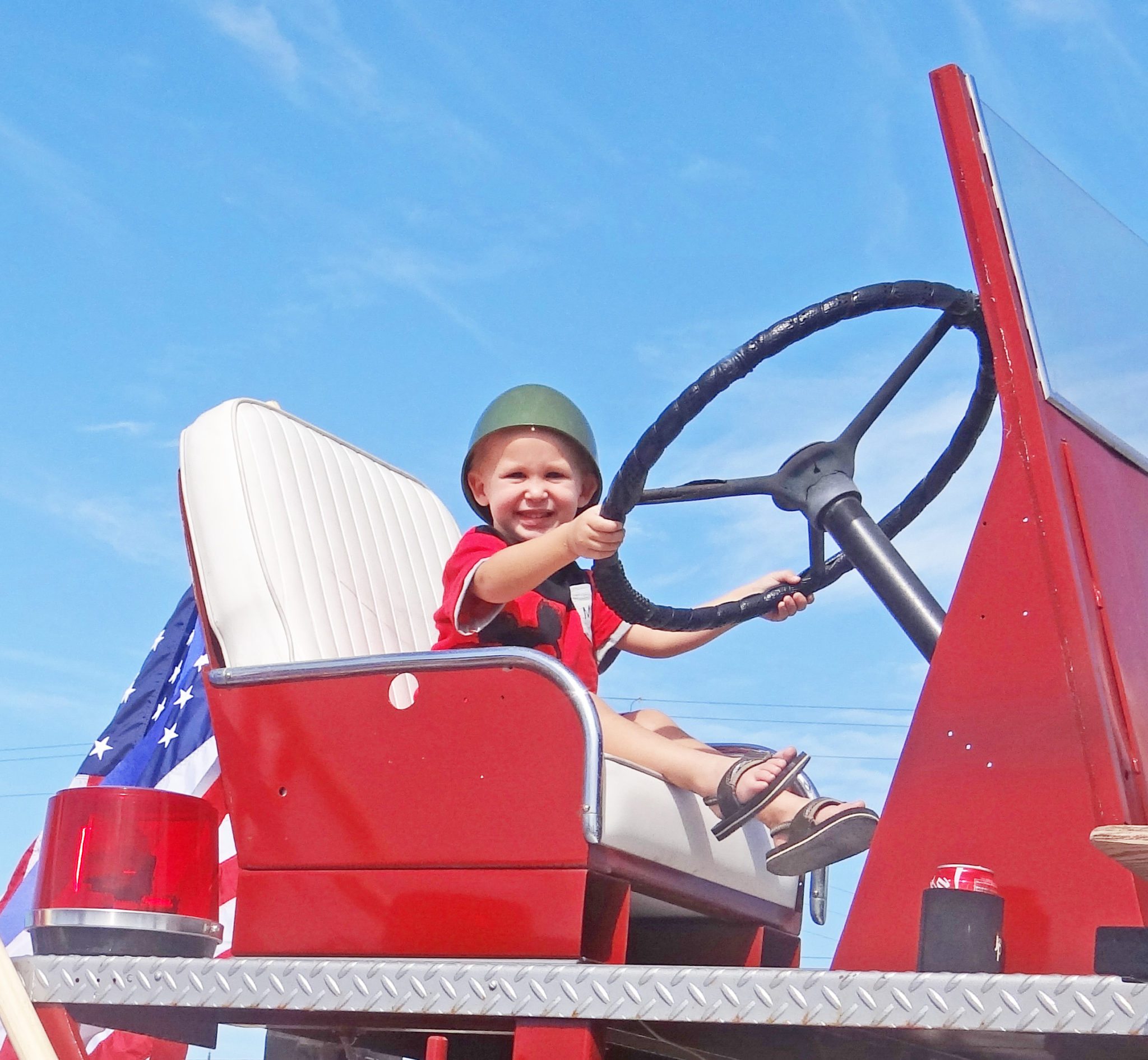 This little dude looks pretty happy at the wheel of the old fire truck.