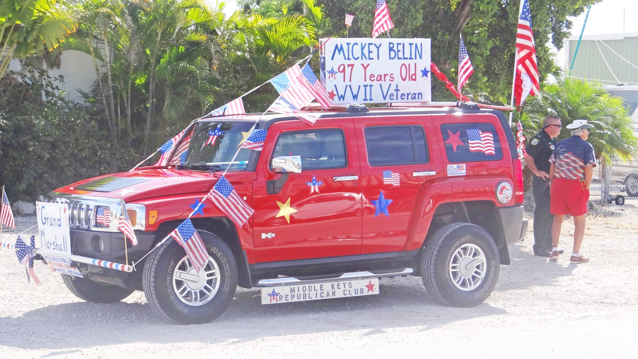 The parade grand marshal, Mickey Belin, rides in the bright red car.