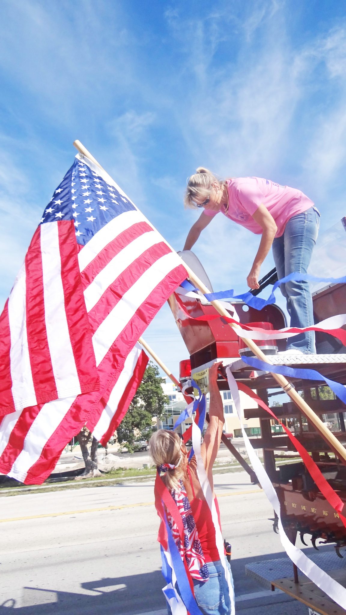 Jenni Cameron, top, adjusts the streamers on the old fire truck.