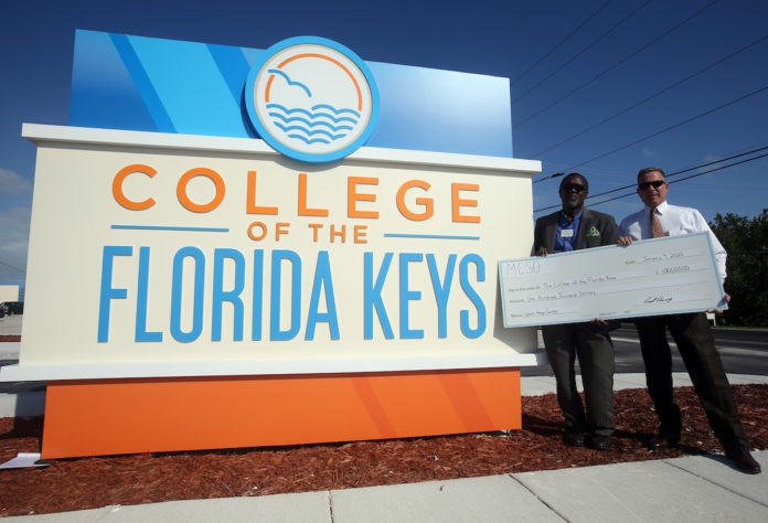 Monroe County Sheriff Rick Ramsay presented College of the Florida Keys President Jonathan Gueverra with a check for $100,000 last week. The donation will help fund the college’s new Key Largo campus.