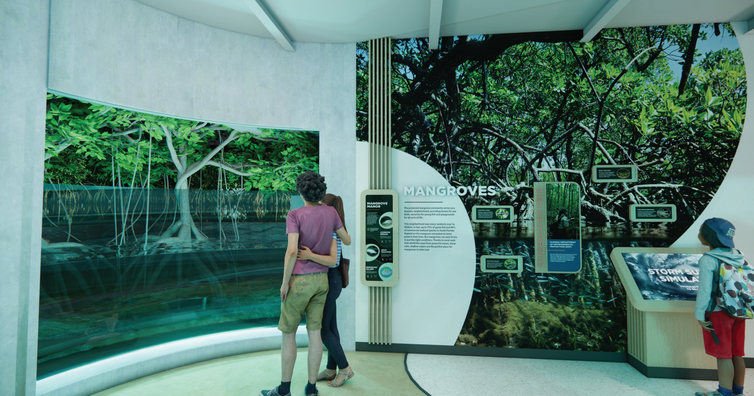 The project will include interactive exhibits and displays with storytelling, soundscaping, thematic lighting and environmental imagery. The aquariums will be filled with native Florida marine species and wildlife observation areas will be included.