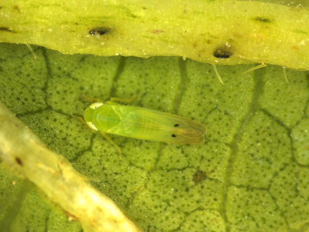 Adults are small, pale green insects with yellowish wings, two black spots on the head, and one black spot on the tip of each wing. They usually sit on the underside of leaves, and adults “hop” when disturbed.