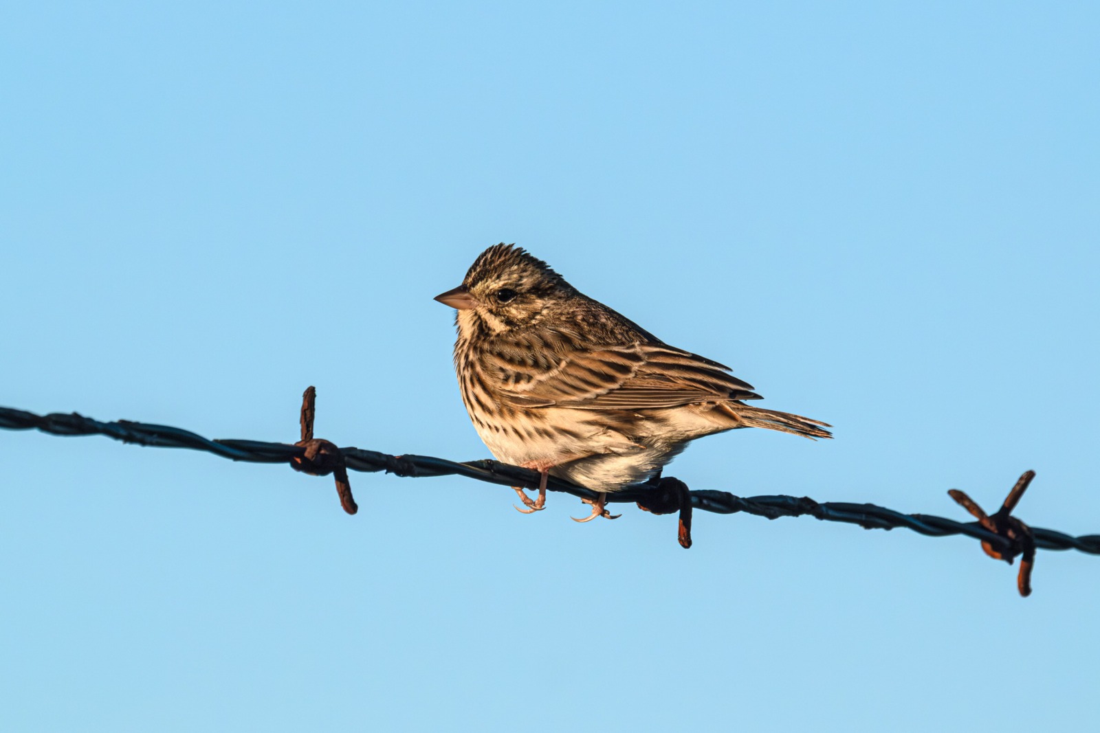 I was reminded of this a week or so ago when I was walking on Boca Chica Beach and a bird hopped up from the beach and landed on the barbed wire over the chain link fence. It did me the favor of not moving, of just sitting there, toes gripping the wire, looking around at the world. I was expecting a palm warbler, but it was bulkier, and wasn’t bopping its tail. It also had a broader, more wedge-shaped bill, built to crack seeds, and yeah, was a sparrow. The question then was, what kind of sparrow?